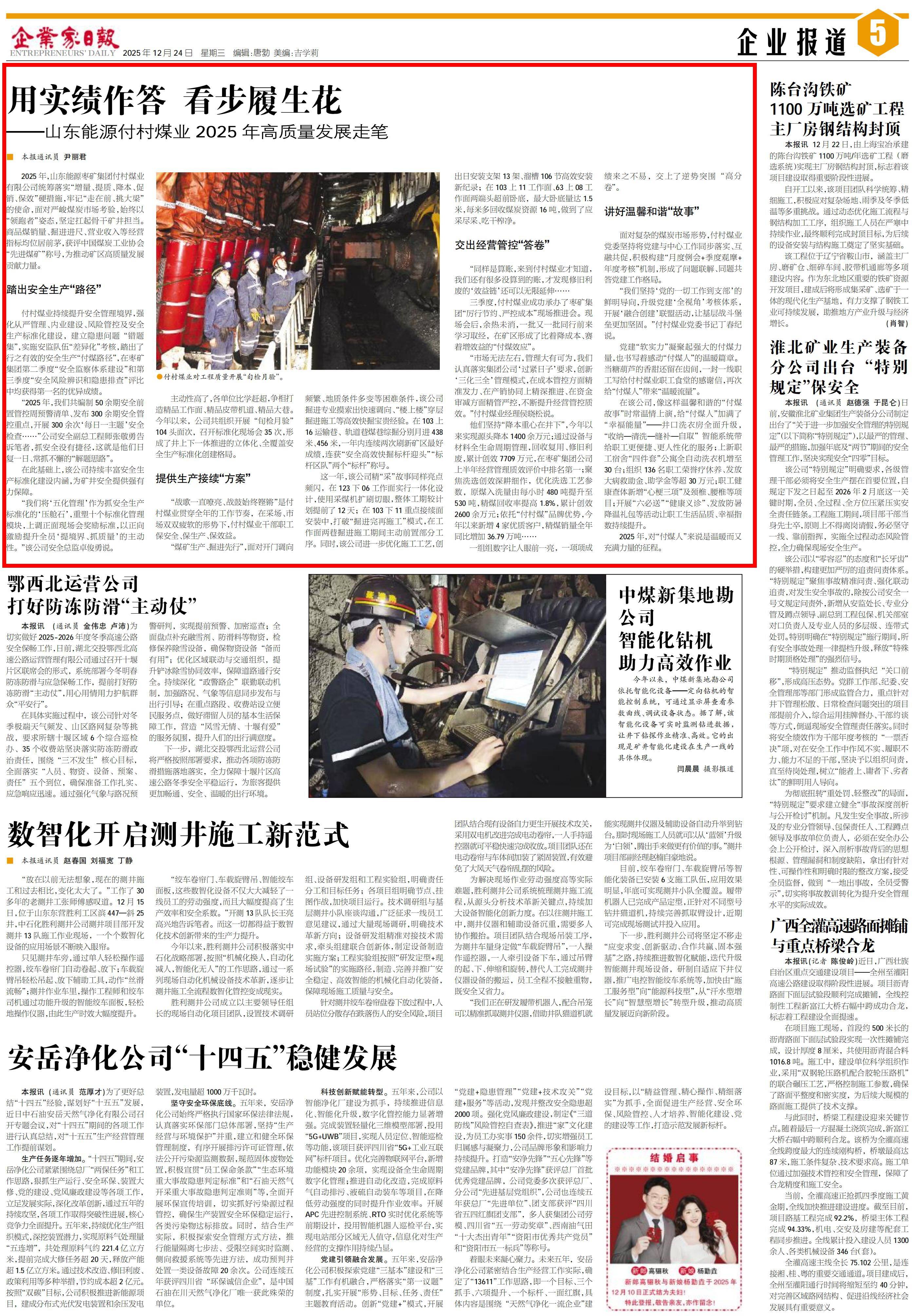 2025年,山东能源伟德国际victor1946付村煤业统筹落实“增量、提质、降本、促销、保效”硬措施,牢记“走在前、挑大梁”的使命,面对严峻煤炭市场考验,始终以“领跑者”姿态,坚定扛起骨干矿井担当。商品煤销量、掘进进尺、营业收入等经营指标均位居前茅,获评中国煤炭工业协会“先进煤矿”称号,为推动矿区高质量发展贡献力量。