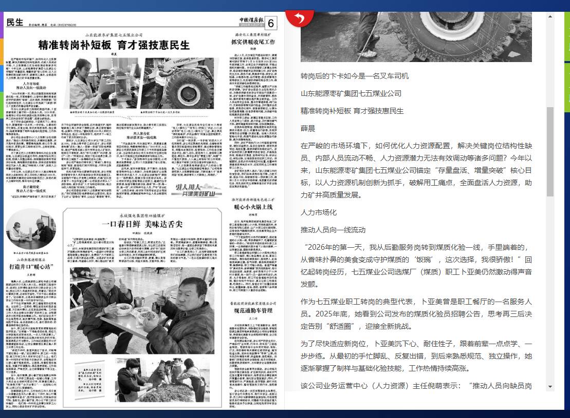 今年以来,七五煤业已有13人通过精准转岗走上适配岗位,职工月均收入增加近2000元,有效缓解关键岗位结构性缺员压力,实现内部人力循环利用、降本与补位双赢。