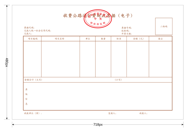 通行费财政电子票据的票据代码为8位,编码规则:第1~2位代表通行费财政电子票据监管机构行政区划编码,第3~4位代表通行费财政电子票据分类编码,第5~6位代表通行费财政电子票据种类编码,第7~8位代表通行费财政电子票据年度编码。票据号码为10位,采用顺序号,用于反映通行费财政电子票据赋码顺序。通行费财政电子票据票样见附件2。