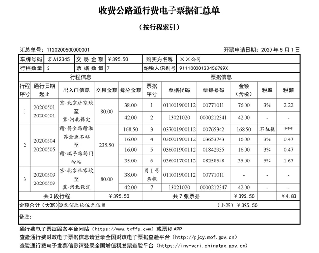 通行费电子发票、通行费财政电子票据统称为通行费电子票据。针对收费公路分段建设、经营管理者多元等特性,为便利通行费电子票据财务处理,根据客户需求,通行费电子票据服务平台(以下简称服务平台)可按一次或多次行程为单位,在汇总通行费电子发票和通行费财政电子票据信息基础上,统一生成收费公路通行费电子票据汇总单(以下简称电子汇总单),作为已开具通行费电子票据的汇总信息证明材料。电子汇总单的汇总信息发生变更的,应重新开具电子汇总单,原电子汇总单自动作废失效,电子汇总单可通过服务平台查询。